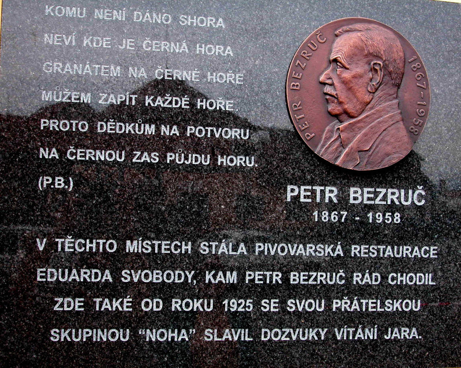 Petra Bezruče (rád se nechal titulovat „Starým ještěrem) bychom dnes rádi připomenuli jako literáta, který kromě Slezska přilnul i jiným kouskům Moravy, k Brnu a okolí. Nakonec kus života strávil právě na Moravě a severně od Brna dodnes najdeme několik docela hlubokých stop, které zde zanechal i jako pochodník přírodou. Málo se ví, že byl iniciátortem a možná i organizátorem výšlapů s partou přátel, kteří přijali společný název, jméno NOHA. Jak si nakonec každý může přečíst na pamětní tabuli na venkovní zdi pivovaru v Černé Hoře, jen pár kroků od brány do dvora a k zahradní restauraci hotelu SLADOVNA****.