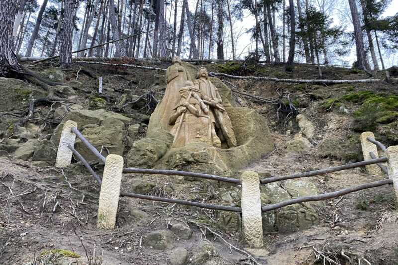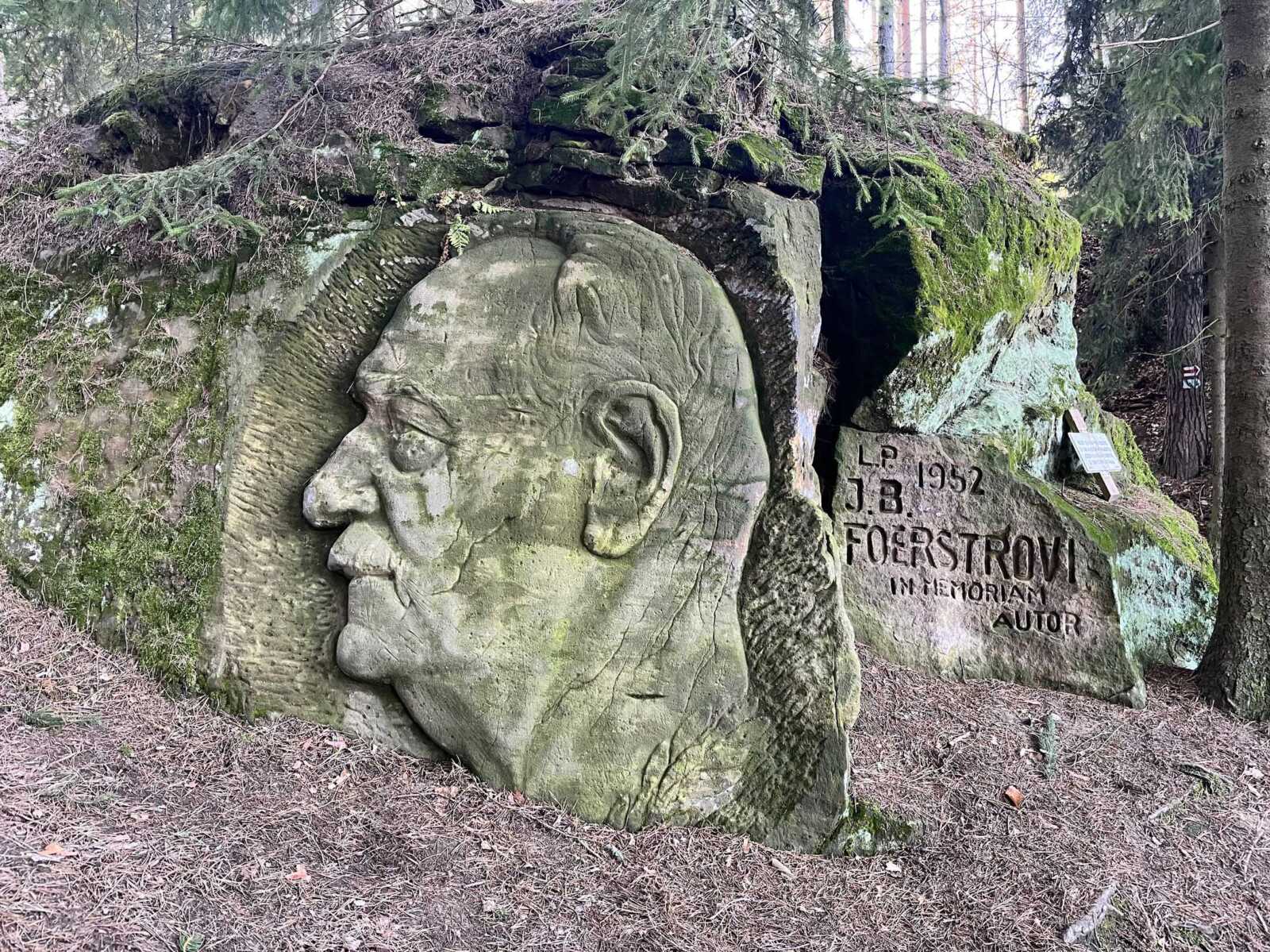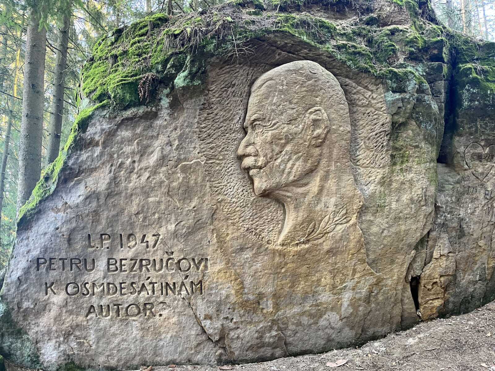 Hodno pozornosti je, že jeho pobyty v regionu neunikly pozornosti vnímavých a literárně vzdělaných lidí se sklony uměleckými a poetickými. Třeba moravskému sochaři Karlu Otáhalovi, který v rostlých pískovcových útvarech skrytých v lese jen kousek jižně od Velkých Opatovic vytvořil v letech 1947 – 1952 dva portrétní reliéfy. Jeden zobrazuje hudebního skladatele Josefa Bohuslava Foerstera (in memoriam) a druhý – Petra Bezruče. K osmdesátým narozeninám. Jako poctu básníkovi, který – ať byl jaký byl, byl svůj. A k tomu ještě jednoho „Starého ještěra“ a nejméně dvě další „hlavy“ – existují celkem oprávněné pochybnosti o autorství – ani „ještěr“ ani obě hlavy nevykazují profesionální sochářské zručnosti a dovednosti. Ale je to až tak důležité?