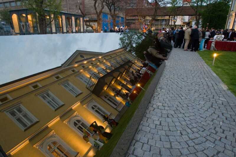 Zdá-li se vám tento záběr poněkud zvláštní, je to zdání oprávněné. Takhle se Central haus,. tedy Rotschildovský zámeček shlíží ve velkém zrcadle mazaně umístěném v exteriéru před zahradou