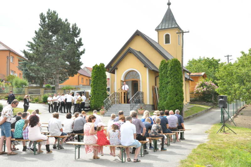 Nedělní ráno – mše svatá před kaplí valchovských patronů Petra a Pavla.