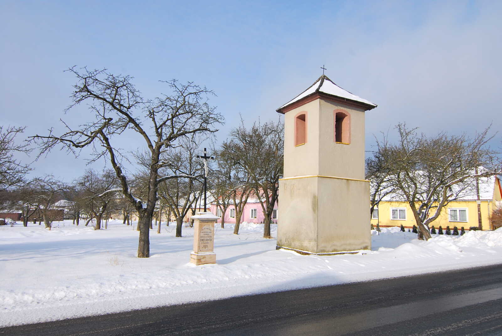 Suchovská zvonice se starým křížkem vás ráda uvítzé i v změ a dokonce vám třeba i zazvoní na rozloučenou a abyste nezapomněli se vracet.